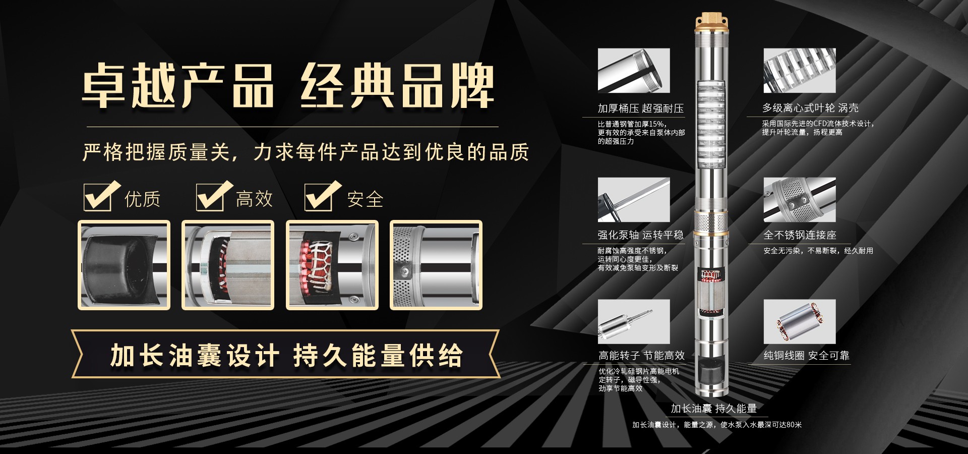 不僅僅是泵,更是流動的科技。十多年來,本公司堅(jiān)持走:以質(zhì)量求生存以科技創(chuàng)新求發(fā)展,重合同守信用的道路,生產(chǎn)經(jīng)營得到迅速發(fā)展。更希望以后不管從發(fā)達(dá)城市到新農(nóng)村,從工業(yè)制造到尖端科技產(chǎn)業(yè)都隨處可見創(chuàng)江井泵的身影,創(chuàng)江深井泵已成為干萬用戶心目中優(yōu)質(zhì)和信心的保證我們將以優(yōu)質(zhì)的產(chǎn)品和最完善的售后服務(wù)來真誠與各界朋友開展廣泛的合作,共同創(chuàng)造一個美好的未來!